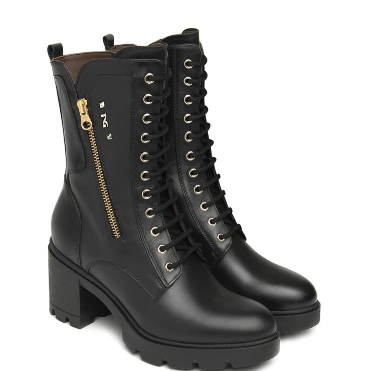 Botas estilo militar elaboradas en piel. Suela de goma con tacón bloque de 7 cm de altura. Cierre con cordones y cremallera lateral interna. Detalle de cremallera dorada decorativa.