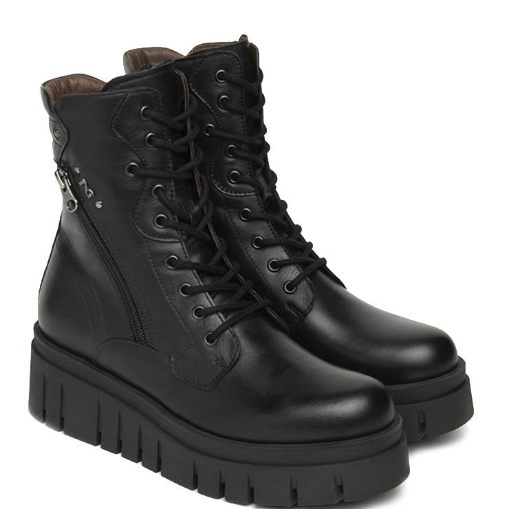 Bota estilo militar elaborado en piel. Suela de goma con plataforma de 5,5 cm de altura. Cierre con cordones y cremallera lateral interior y exterior.