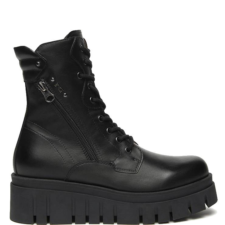 Bota estilo militar elaborado en piel. Suela de goma con plataforma de 5,5 cm de altura. Cierre con cordones y cremallera lateral interior y exterior.