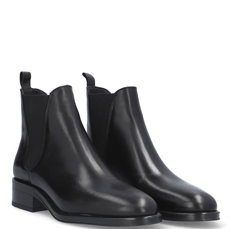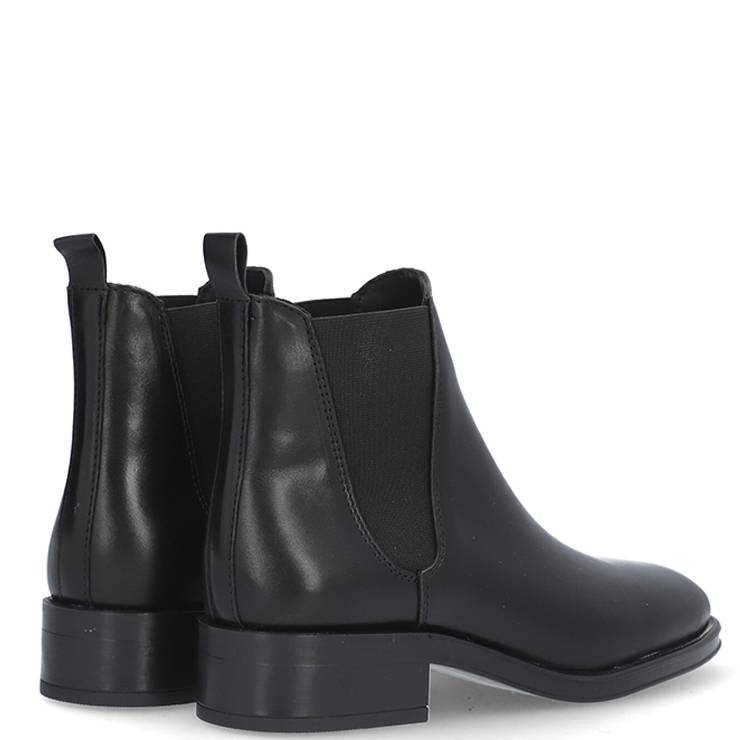 Botín de caña baja en piel lisa. Ajuste con elásticos en ambos laterales. Tirador en la parte trasera. Tacón ancho de 3,5 cm.
