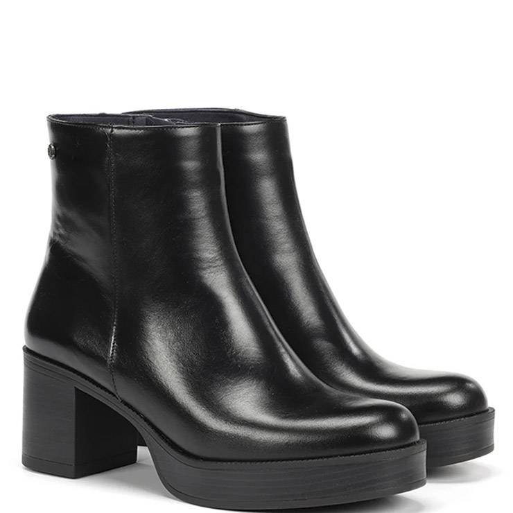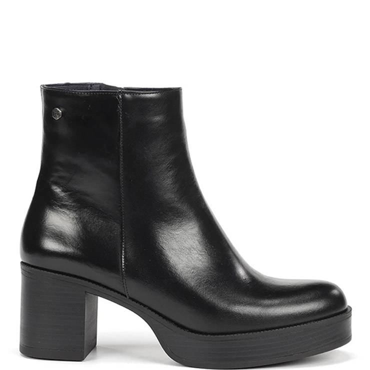 Botín de tacón elaborado en piel lisa con acabado de brillo. Suela de PU de plataforma de 2cm y tacón de 7 cm de altura. Cierre con cremallera lateral interna.