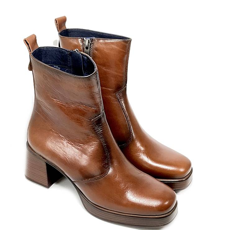 Botín de tacón elaborado en piel lisa con acabado de brillo. Suela de PU de plataforma de 2cm y tacón de 7 cm de altura. Cierre con cremallera lateral interna.