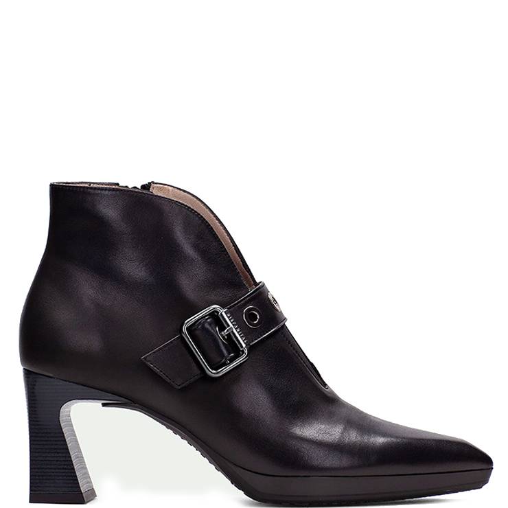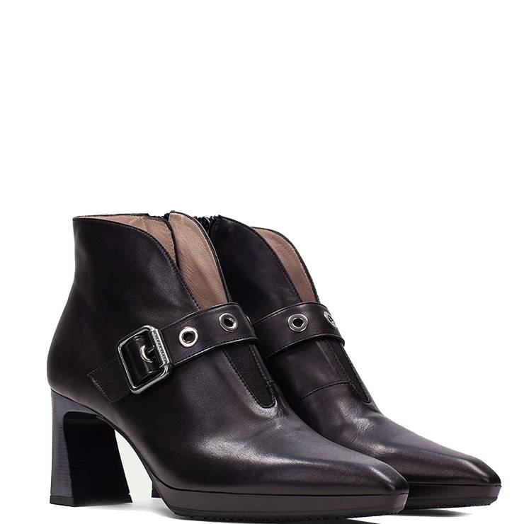 Botín elaborado en piel. Punta afilada. Detalle decorativo de hebilla. Suela de PTP con tacón de 4,5 cm de altura. Cierre con cremallera lateral. Plantilla con tecnología Triflow.
