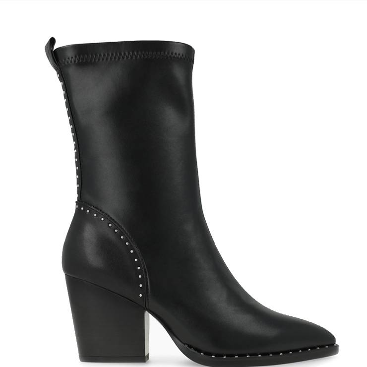 Botín tipo campero elaborado en piel sintética. Detalle de remaches metálicos. Suela de TPU Compacto y tacón cubano de 8 cm de altura. Cierre con cremallera lateral. Interior en tejido y planta en piel. Planta new gel.
