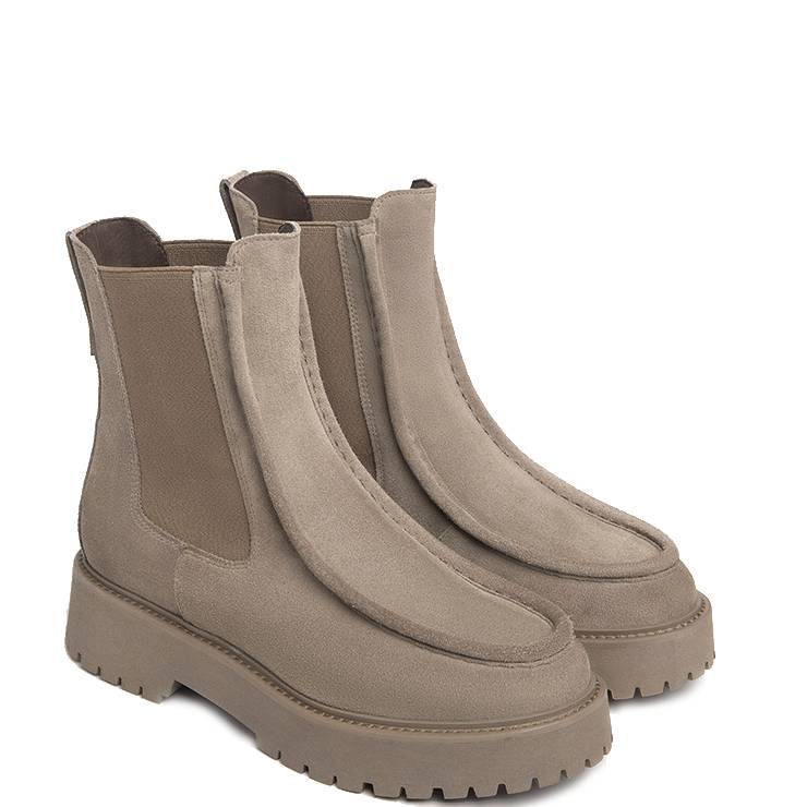 Botín estilo chelsea elaboradas en ante. Forro y plantilla en cuero de gran calidad. Suela de goma de 4 cm. Sin cierre con elásticos en los laterales. Plantilla no extraíble.
