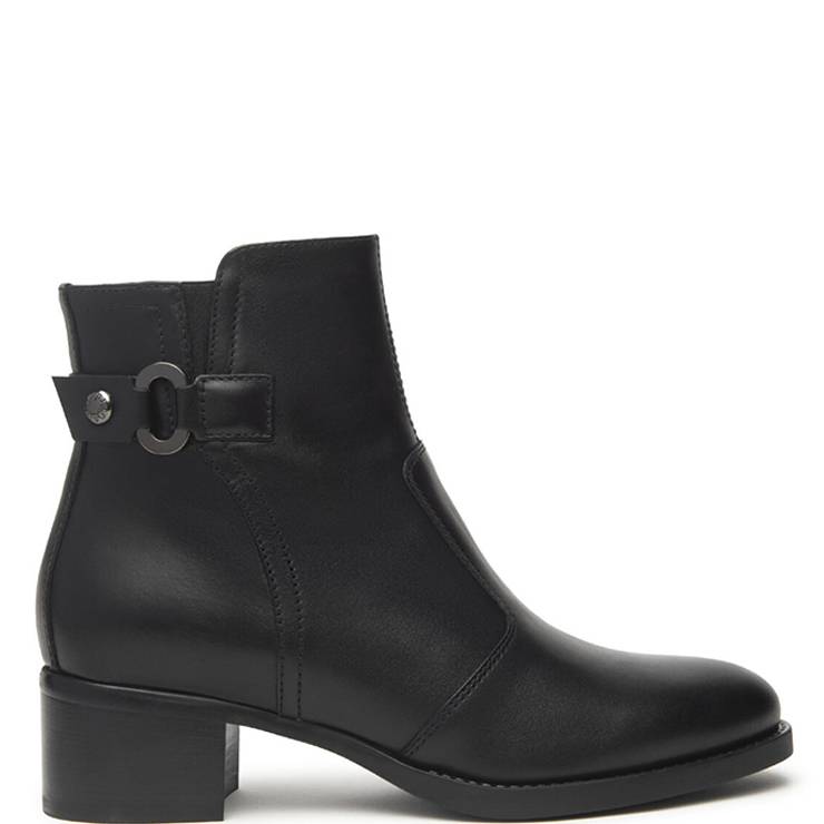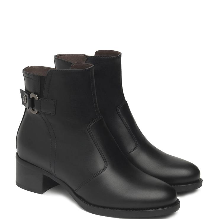Botín elaborado en piel. Detalle de anilla metálica. Suela de goma y tacón bloque de 4 cm de altura. Plantilla extraíble de PU DryGo® y función Memory. Cierre con cremallera lateral.