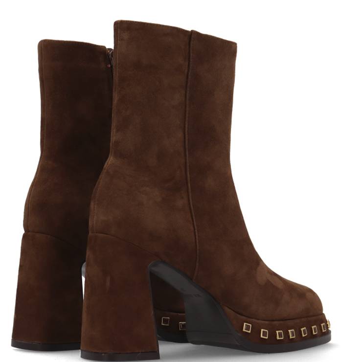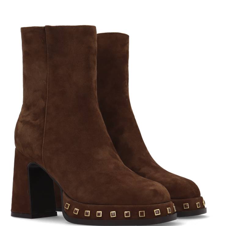 Botín elaborado en serraje. Detalle de tachuelas cuadradas en la suela. Suela de goma forrada con plataforma de 2 cm y tacón ancho de 8 cm. Cierre con cremallera lateral interna.