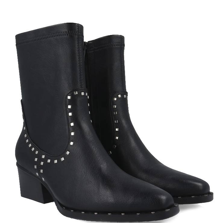 Botín campero elaborado en piel vegana. Forro textil. Suela de goma con tacón de 5 cm. Detalle de tachuelas plateadas.