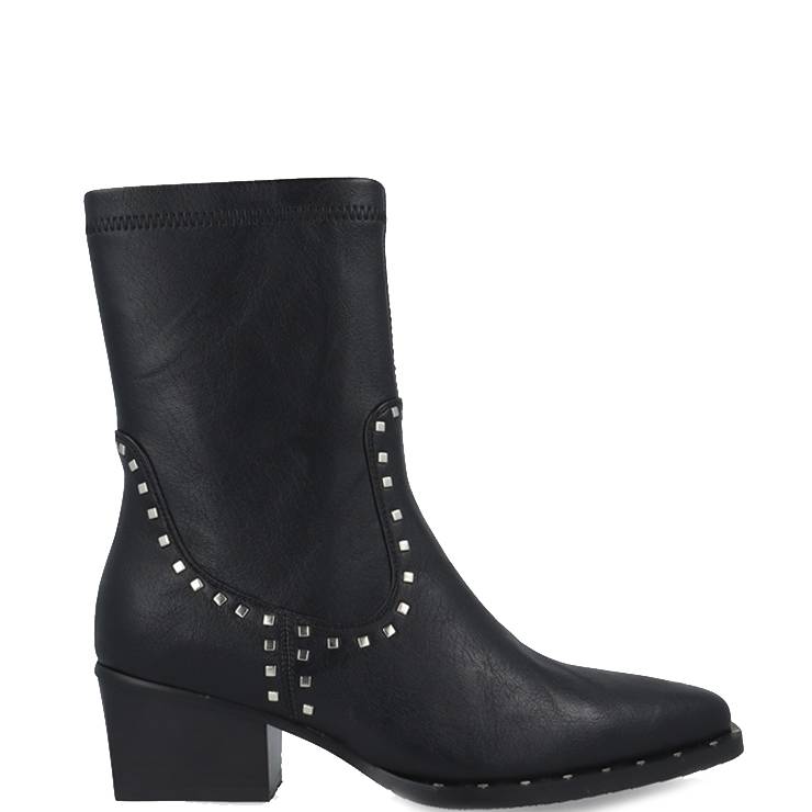 Botín campero elaborado en piel vegana. Forro textil. Suela de goma con tacón de 5 cm. Detalle de tachuelas plateadas.
