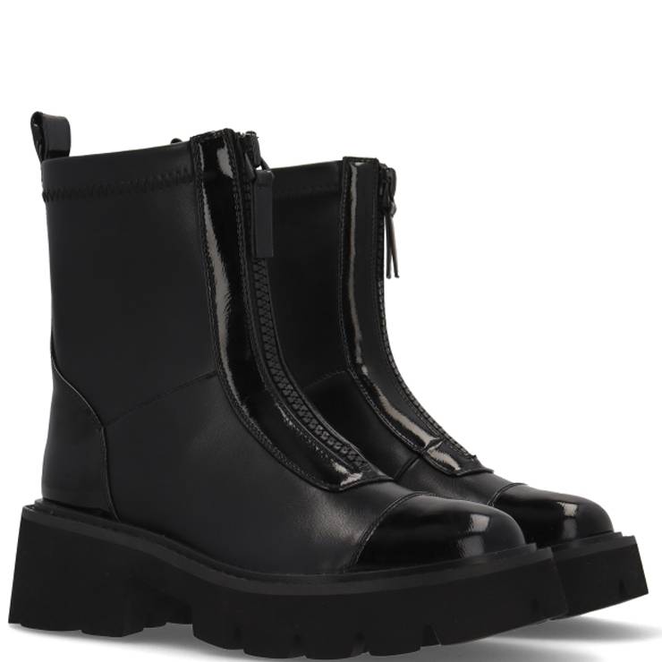 Botín elaborado en material sintético y charol. Punta redondeada. Cremallera central. Suela track de goma de 4,7 cm de altura.