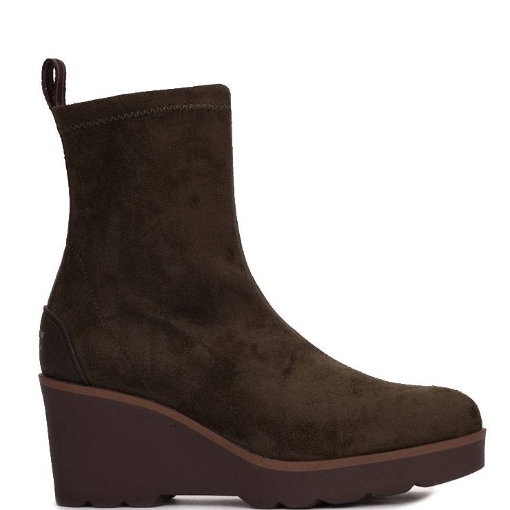 Botín de estilo calcetín de tejido elástico efecto ante. Suela de caucho de 2 cm con cuña de 7 cm.