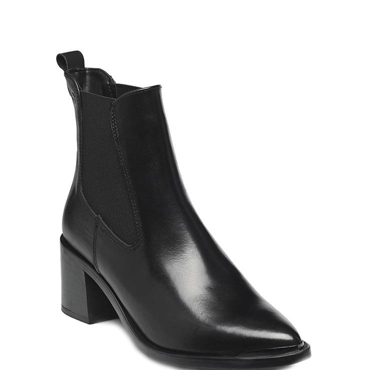 Botín estilo campero elaborado en piel lisa. Punta fina y estilizada con detalle metálico. Suela de goma y tacón cuadrado de 6,0 cm. Plantilla suave con Touchit. Elásticos en los laterales para facilitar el calce.