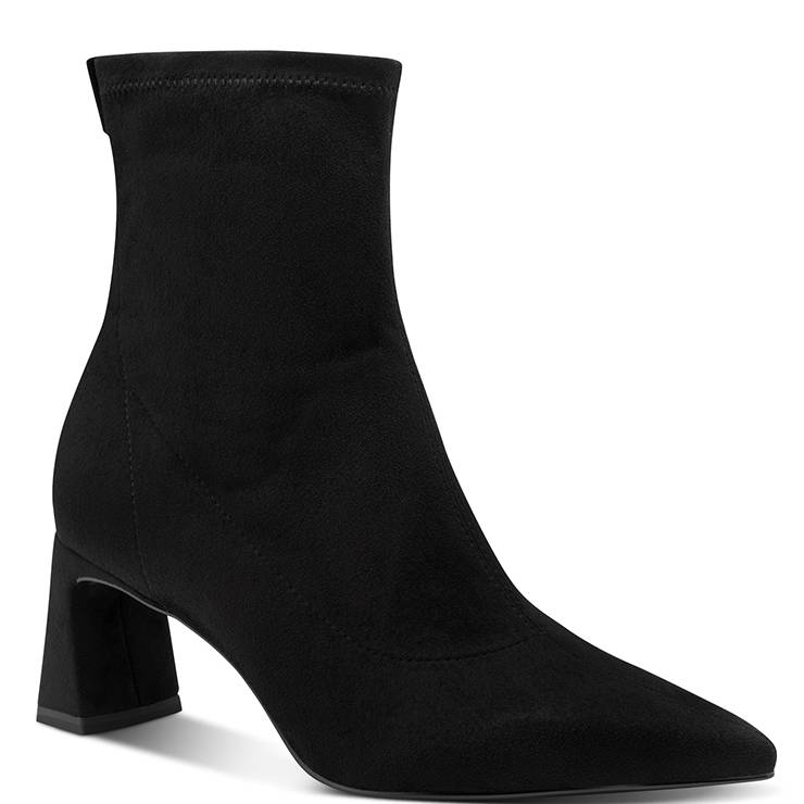 Botín elaborado en material textil ligeramente elástico y afelpado. Punta afilada. Tacón de 6,5 cm de altura. Suela de goma con tecnología Antislide y Antishokk. Cierre con cremallera lateral interna.