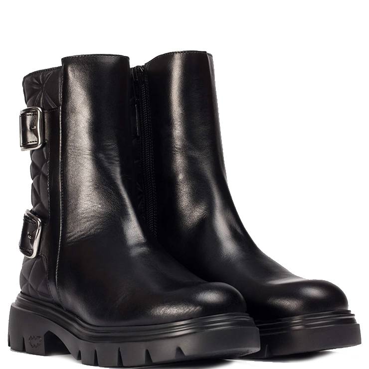 Botín estilo biker elaborado en piel y textil. Parte trasera acolchada. Hebillas metálicas. Suela de goma EVA con tecnología FlyGrip y tacon ancho de 5 cm. Plantilla interior de MemoryGel.