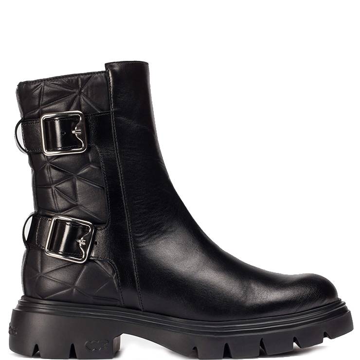 Botín estilo biker elaborado en piel y textil. Parte trasera acolchada. Hebillas metálicas. Suela de goma EVA con tecnología FlyGrip y tacon ancho de 5 cm. Plantilla interior de MemoryGel.