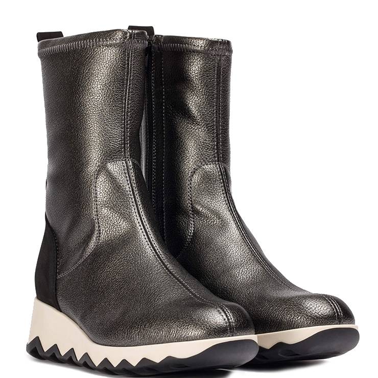 Botín elaborado en piel texturizada metalizada. Cierre con cremallera lateral. Suela de goma EVA con cuña de 4 cm.