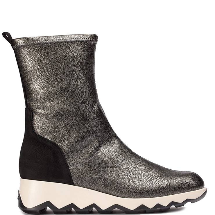 Botín elaborado en piel texturizada metalizada. Cierre con cremallera lateral. Suela de goma EVA con cuña de 4 cm.