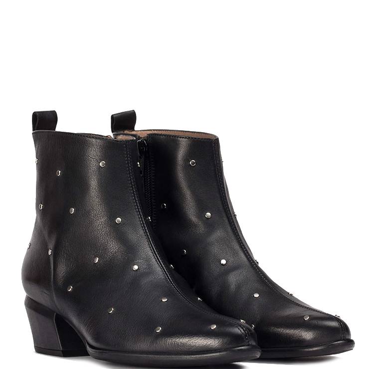 Botín elaborado en piel con microtachas metálicas. Cierre con cremallera lateral interior. Puntera afilada. Suela flexible de cuerolite con tacón de 5,5 cm de altura.