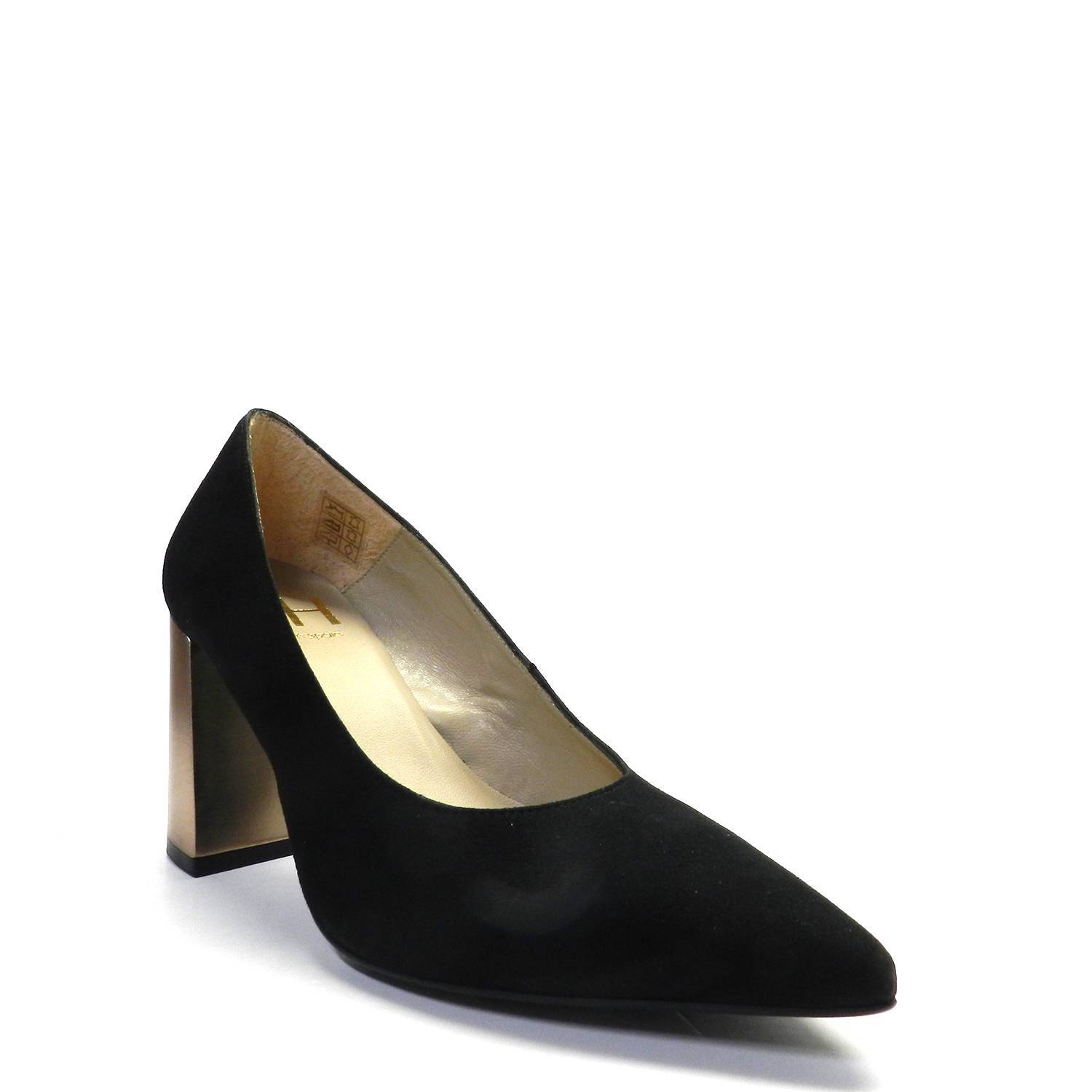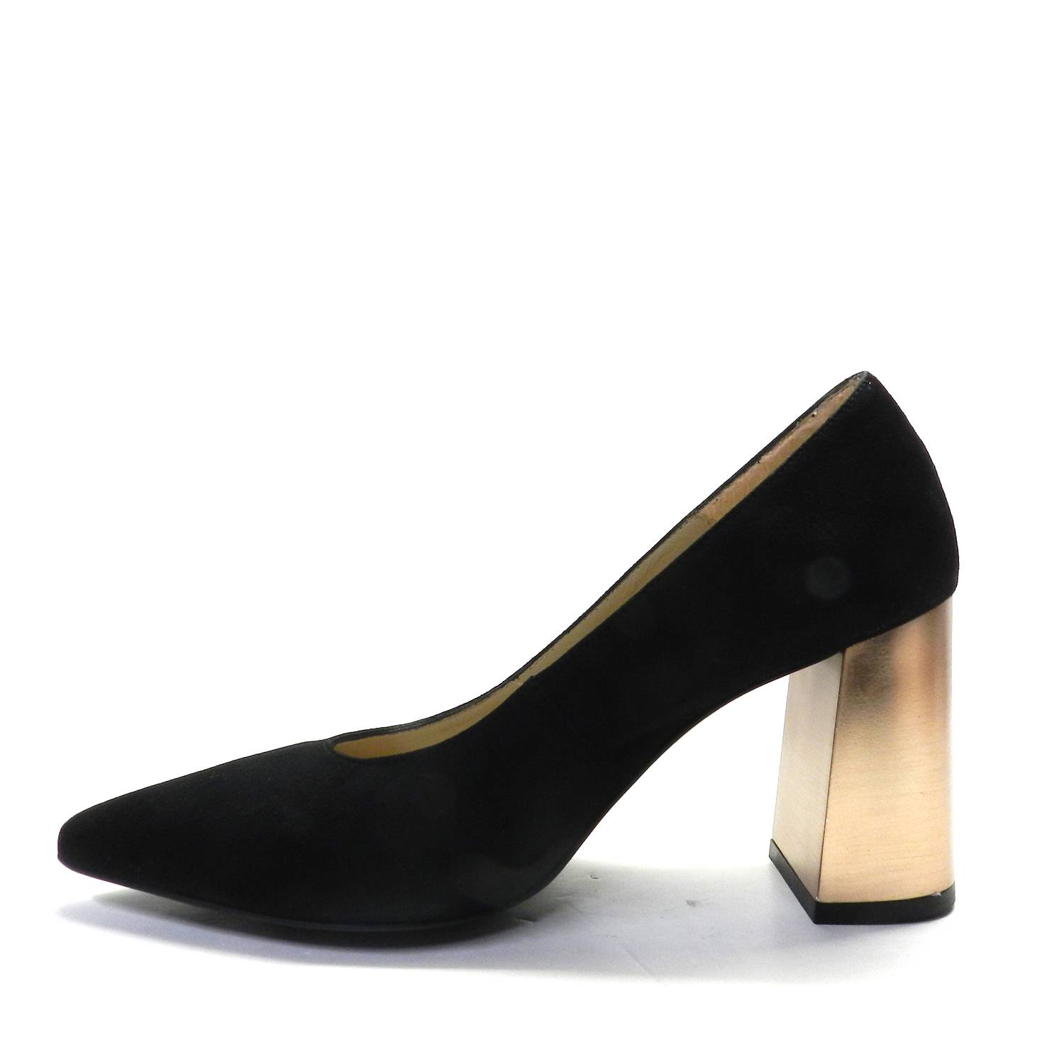 Salón de la marca Wonders, modelo M5001 en color negro. Zapato de salón en ante ante con punta fina y tacón ancho bañado en oro. Plantilla almohadillada de gel.