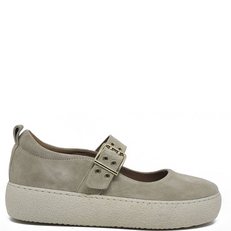 Merceditas elaborada en piel de ante. Cierre ajustable con hebilla y detalle de ojetes. Punta redondeada. Maxi suela de goma crepe con plataforma de 3 cm.
