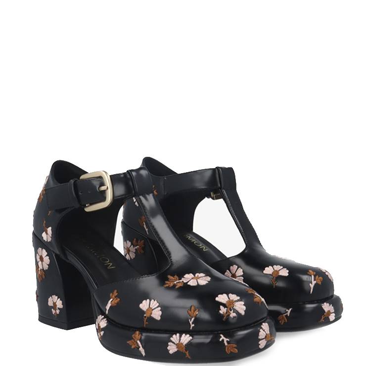 Merceditas de napa vegana. Detalle de flores bordadas. Suela de goma EVA de 2,2 cm y tacón de 8 cm. Cierre ajustable con hebilla.