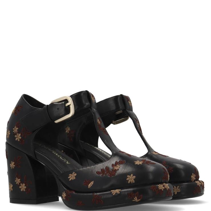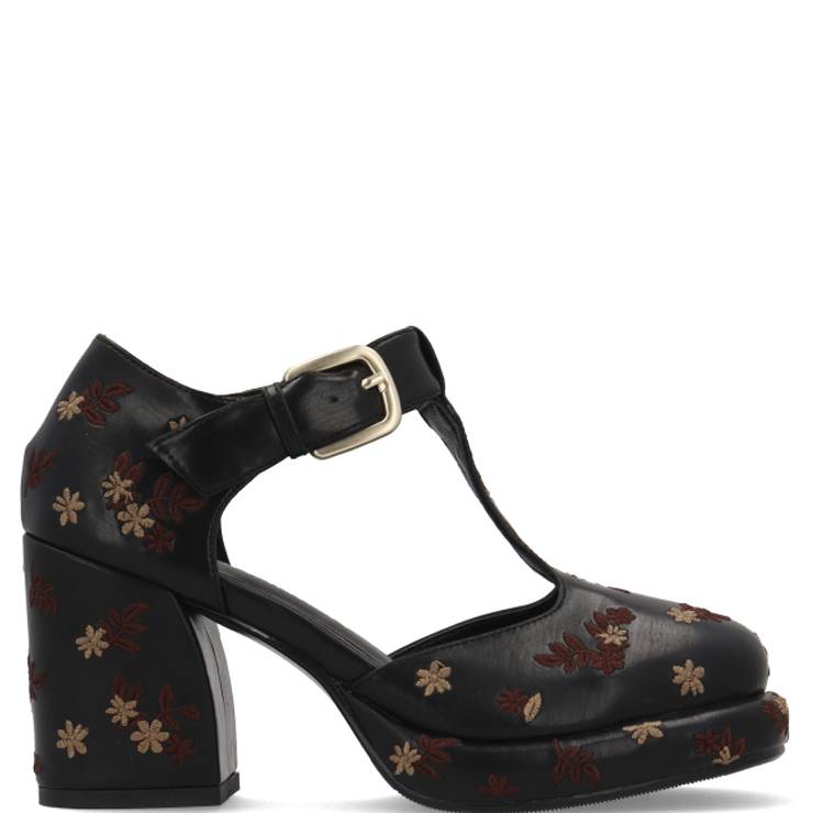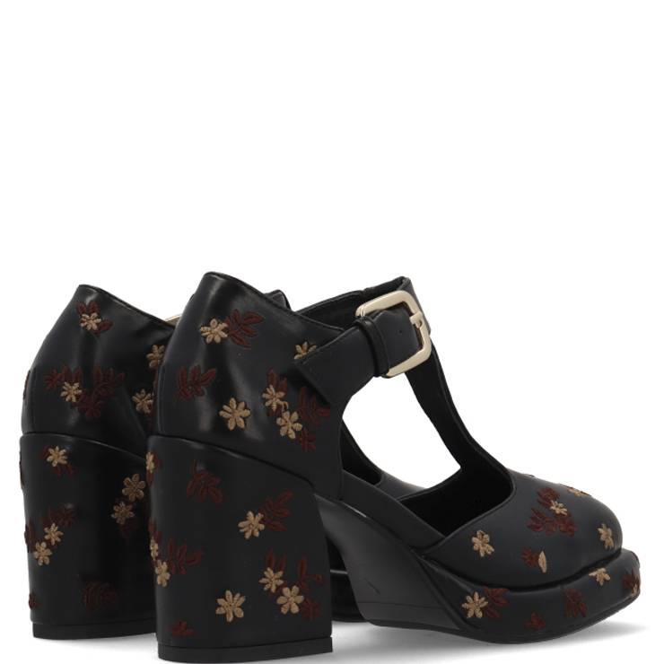 Merceditas de napa vegana. Detalle de flores bordadas. Suela de goma EVA de 2,2 cm y tacón de 8 cm. Cierre ajustable con hebilla.