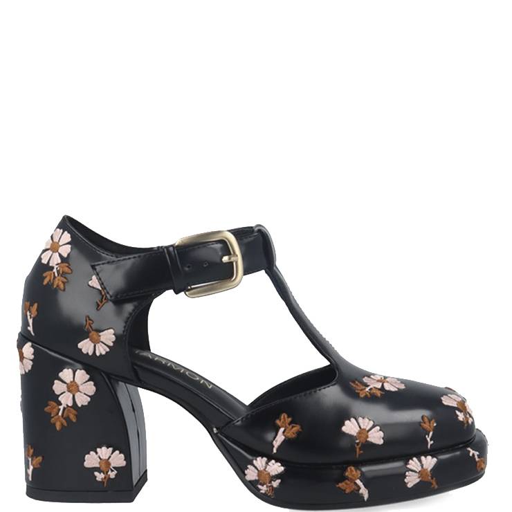 Merceditas de napa vegana. Detalle de flores bordadas. Suela de goma EVA de 2,2 cm y tacón de 8 cm. Cierre ajustable con hebilla.