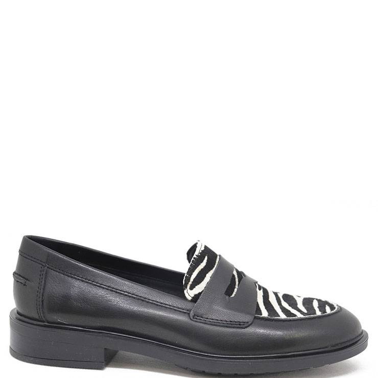 Mocasín elaborado en napa. Detalle de estampado de cebra en la pala. Suela de goma con tacón ancho de 2 cm de altura.