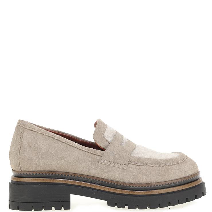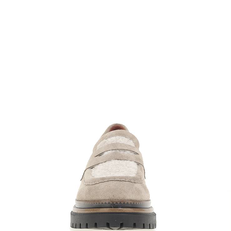 Mocasín elaborado en ante. Suela de goma dentada de 4,5 cm de altura. Detalle de borreguito gris en el empeine. Plantilla de piel.