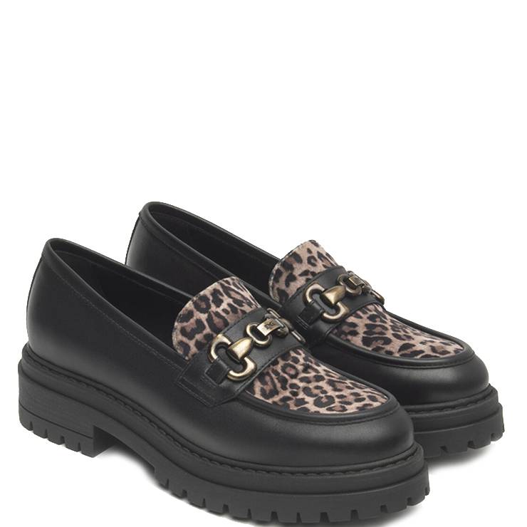Mocasín elaborado en piel y material técnico. Detalle de eslabón en el empeine y estampado animal print. Suela track de goma con tacón block de 4 cm de altura.