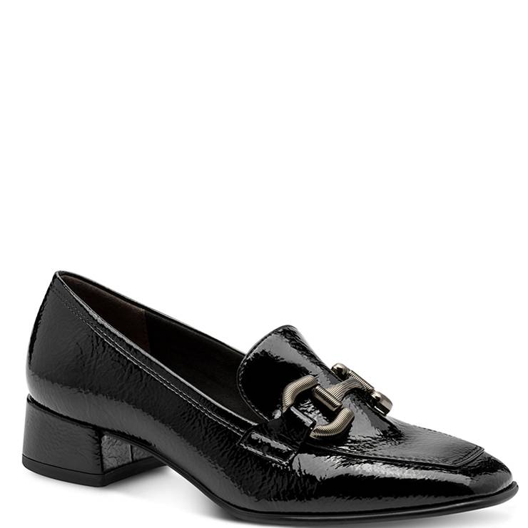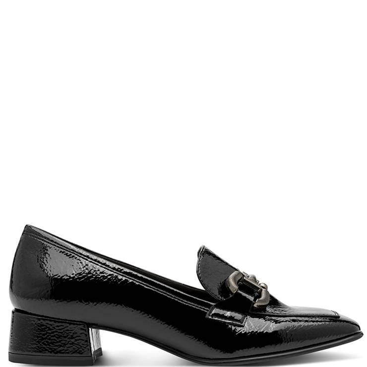 Mocasín de charol. Tacón ancho de 3,5 cm de altura. Plantilla sintética acolchada. Suela de goma. Detalle de eslabón plateado en el empeine.