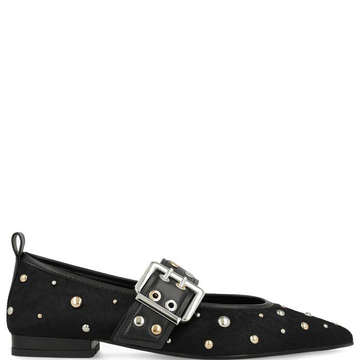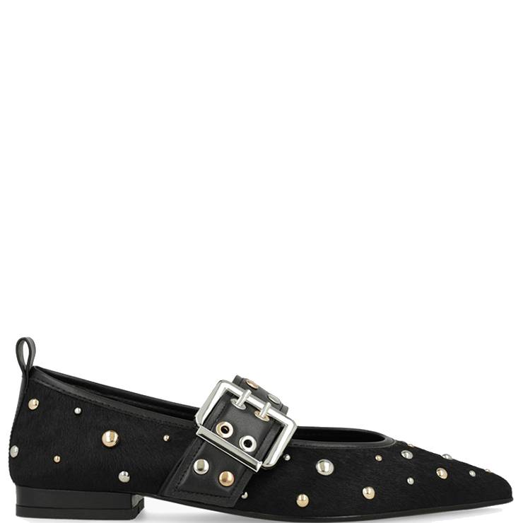 Bailarina elaborada en piel con acabado de pelo. Detalle de tachas metálicas y tira en empeine con hebilla. Suela TPU compacto y tacón bloque de 1,5 cm de altura. Punta afilada. Forro de piel. Plantilla new gel de gran comodidad.