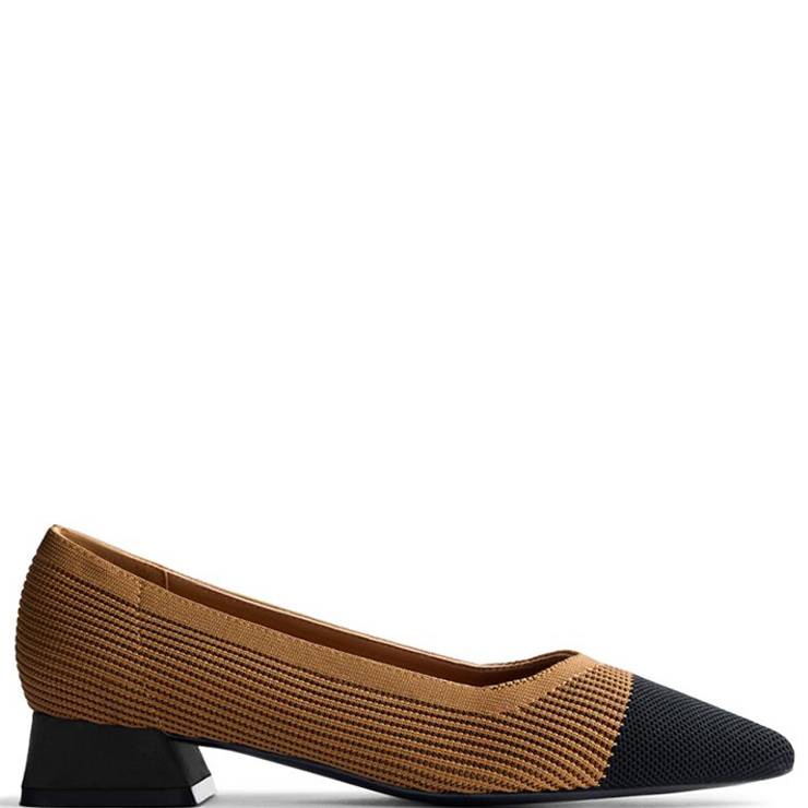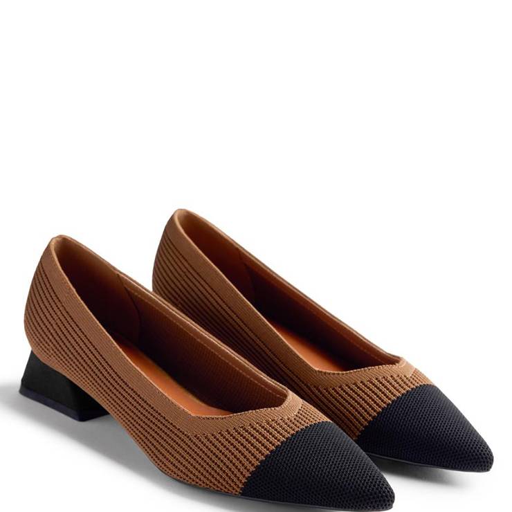 Salón elaborado en poliéster transpirable. Punta afilada en contraste. Planta acolchada. Suela de caucho flexible y tacón bajo tipo bloque de 3 cm.