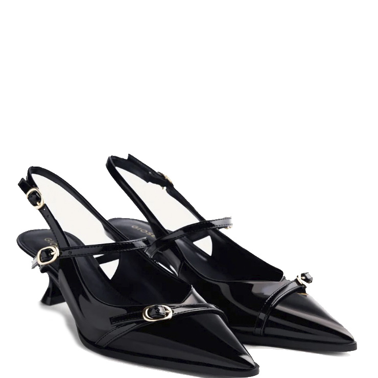 Salón destalonado con acabado en efecto charol. Detalle de hebillas. Punta afilada. Cierres ajustables y planta acolchada. Suela de caucho flexible y tacón bajo de 4 cm.