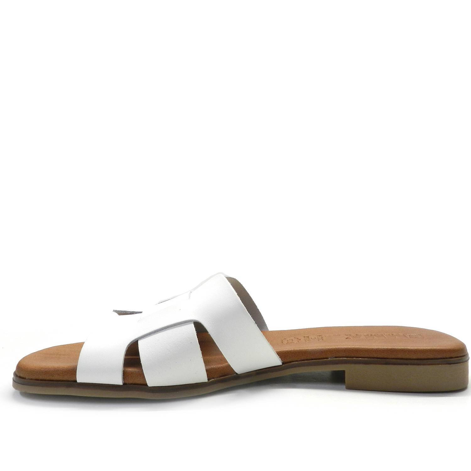 Sandalia de la marca Escala modelo Sacalm en color blanco. Sandalia plana tipo pala de piel lisa. Banda ancha entrelazada y planta acolchada de piel. Muy cómoda y perfecta para cualquier ocasión.