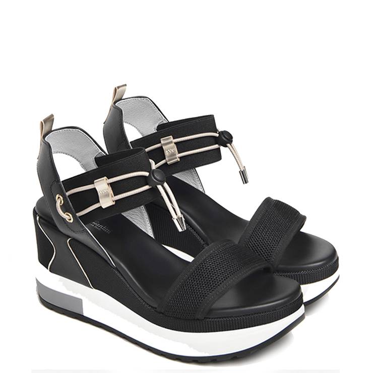 Sandalia deportiva con cuña y tira en la parte delantera. Altura de la cuña 9 cm y plataforma de 4,5 cm.