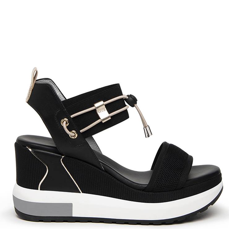 Sandalia deportiva con cuña y tira en la parte delantera. Altura de la cuña 9 cm y plataforma de 4,5 cm.