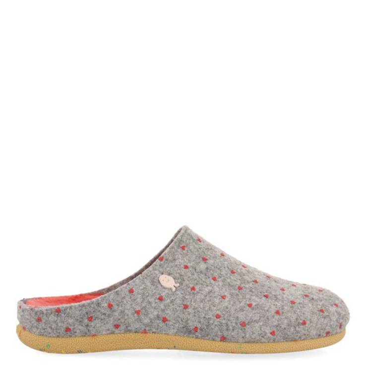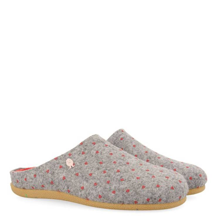Zapatillas casa de la marca Gioseppo modelo Hittisau en fucsia. Gioseppo de la colección Hot Potatoes. Zapatillas de casa tipo babucha en color gris con estampado de topos fucsia e interior en color fucsia. Corte en fieltro PET recilado, ribete de tejido poliéster suave. Planta afelpada de tejido suave. Plantillas extraíbles de espuma. Suela de caucho natural.