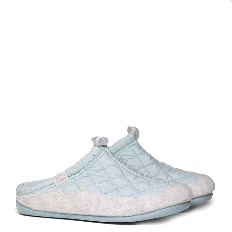 Zapatillas de la marca Toni Pons, modelo Mel-Um en color verde. Zapatillas de casa tipo zueco que combina tejido acolchado con fieltro. Plantilla extraíble y suela de goma. Pequeña cuña de 2,5 cm que aporta gran comodidad.