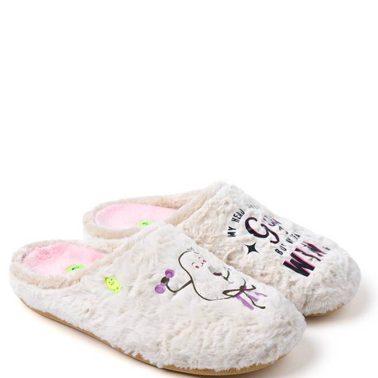 Zapatillas de casa destalonadas de pelo con dibujo y frase. Plantilla de pelo, acolchada y extraíble. Suela flexible 75% caucho natural con virutas de EVA reciclada.