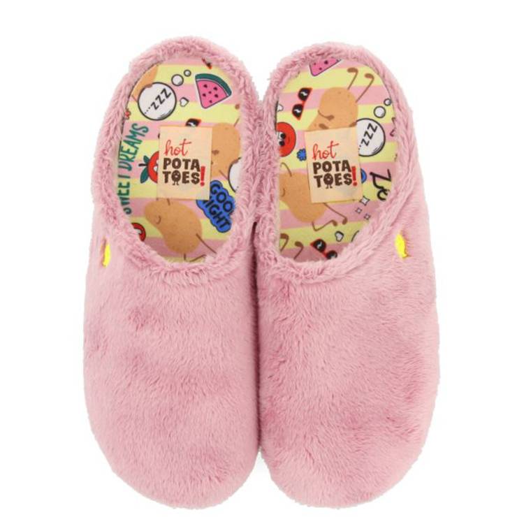 Zapatillas de casa destalonadas en pelo sintético. Planta estampada en materiales reciclados. Ribete de pelo muy suave. Plantilla extraíble con materiales 100% reciclados. Suela de goma natural y pintas de goma EVA reciclada de colores. Forro transpirable.