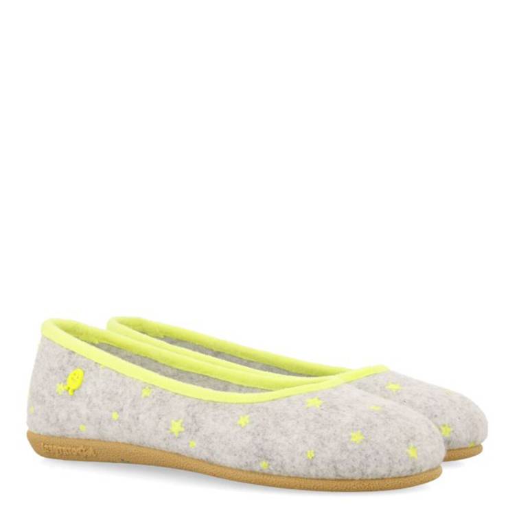 Zapatillas de casa de la marca Gioseppo modelo Mace en color gris y amarillo. Zapatillas de estar por casa tipo bailarina en fieltro PET reciclado con print flúor en relieve con detalle de estrellas. El ribete es de pelo color flúor y la planta de pelo. Plantilla extraíble de espuma de poliuretano 100% reciclado. Suela de caucho natural en tono caramelo y con viruta de colores de goma EVA.