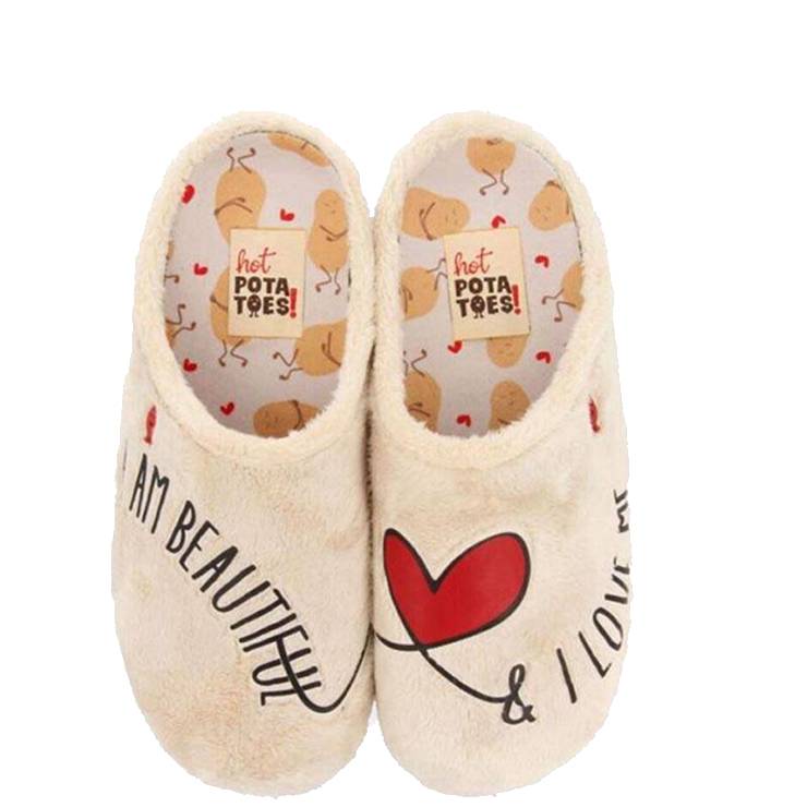 Zapatillas de casa destalonadas en pelo sintético. Planta estampada en materiales reciclados. Detalle de texto y corazón. Plantilla extraíble con materiales 100% reciclados. Suela de goma natural y pintas de goma EVA reciclada de colores. Forro transpirable.