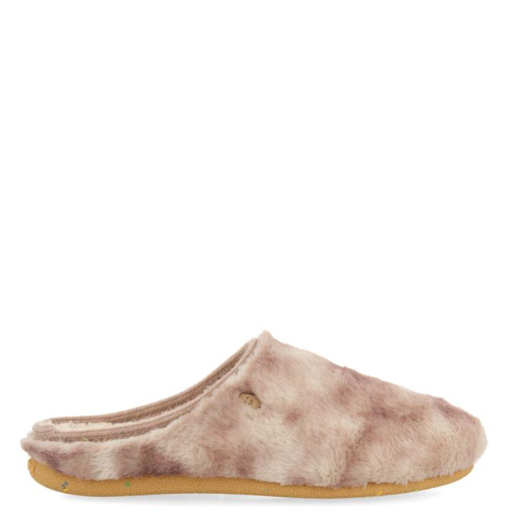 Zapatillas de la marca Gioseppo modelo Velike en beig. Zapatillas de casa tipo babucha. Corte estampado Tie-dye sobre pelo. Ribete de pelo y la planta de borreguito de material muy suave. Plantilla extraíble de espuma de poliuretano 100% reciclado y la suela de caucho.