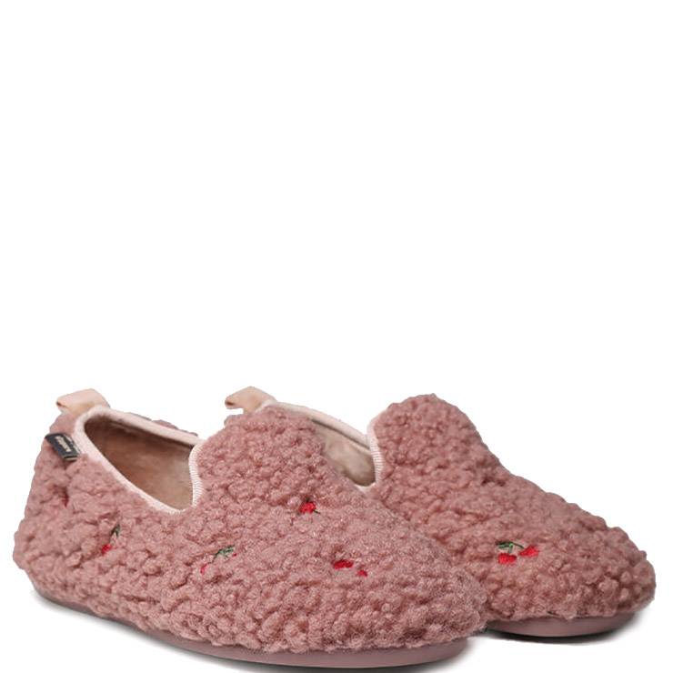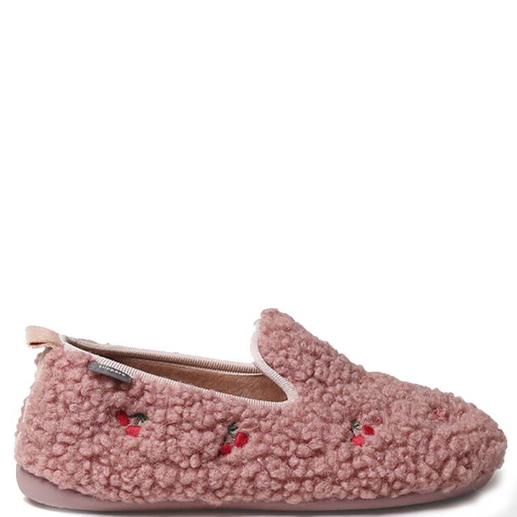 Zapatillas de casa tipo babuchas con borreguito y cerezas bordados. Suela de goma antideslizante. Plantilla interior de tejido suave que ofrece un gran confort.