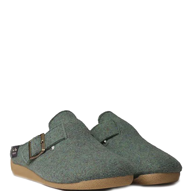 Zapatillas de casa tipo zueco elaboradas en fieltro. Ajuste con hebilla para mayor sujeción. Suela de goma antideslizante de 3 cm de grosor. Plantilla interior forrada en suave pelo sintético.