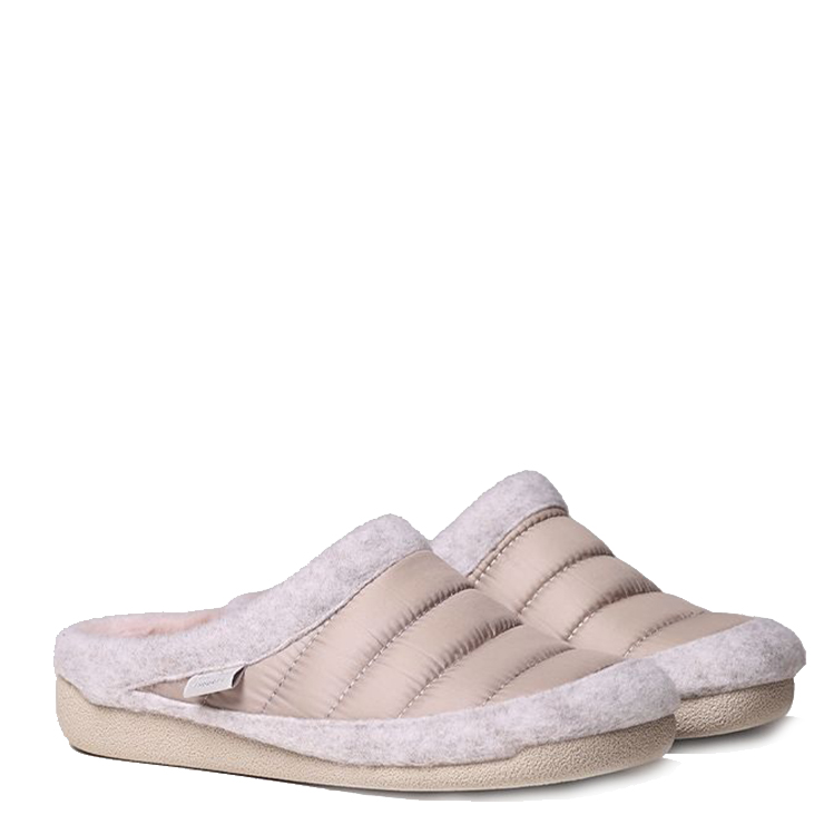 Zapatillas de la marca Toni Pons modelo Moly-Dr en color beig. Zapatilla de casa que combina tejido acolchado y fieltro al tono, con forro interior de suave pelo. Suela de goma plana de 2,5cm de grosor y está hecha de goma.
