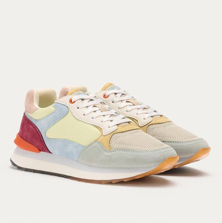 Zapatillas de la marca Hoff modelo City Cartagena de Indias. Zapatillas deportivas con cordones formada por piezas cortadas combinando diferentes materiales en diferentes tonalidades. Rejilla en poliéster transpirable. Plantilla extraíble de memory foam. Media suela de EVA de 3 cm de altura. Patín dentado en goma transparente con imagen serigrafiada.