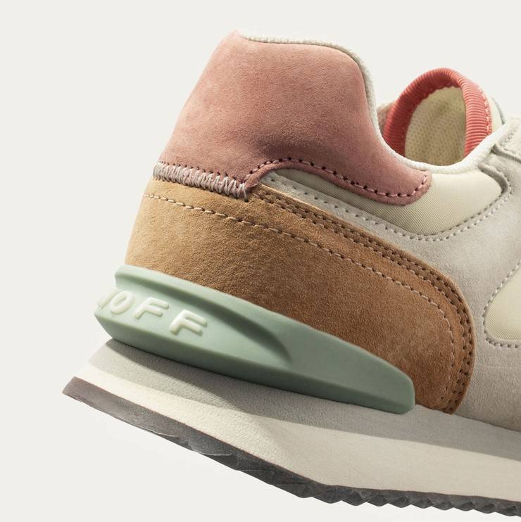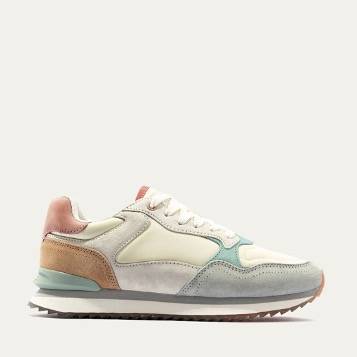 Zapatillas de la marca Hoff modelo City Rome. Zapatillas deportivas con cordones formada por piezas cortadas combinando diferentes materiales en diferentes tonalidades. Rejilla en poliéster transpirable. Plantilla extraíble de memory foam. Media suela de EVA de 3 cm de altura. Patín dentado en goma transparente con imagen serigrafiada.