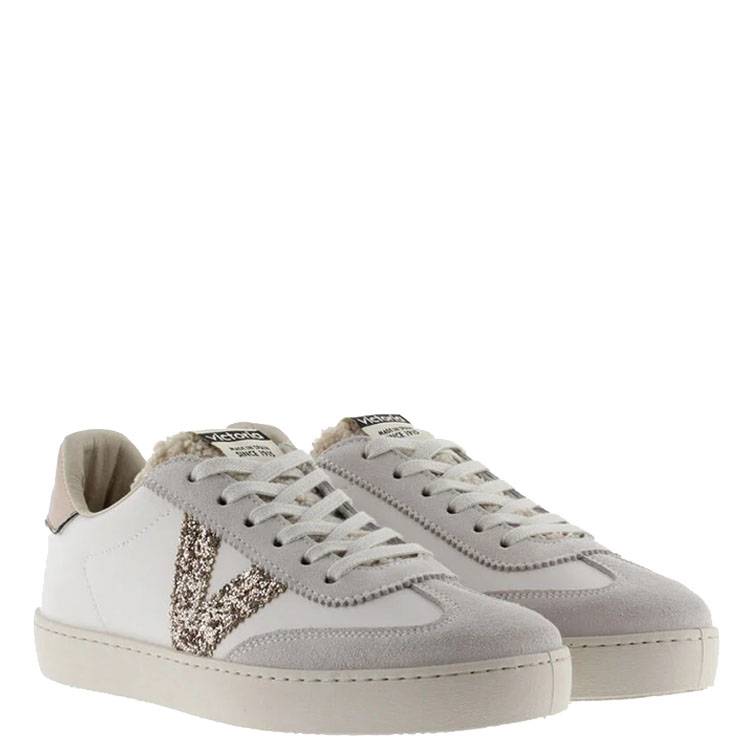 Zapatillas deportivas en piel, ante y piel sintética con detalles de glitter en la V. Lengüeta con detalles de borreguito. Suela de goma de 1,5 cm de altura.